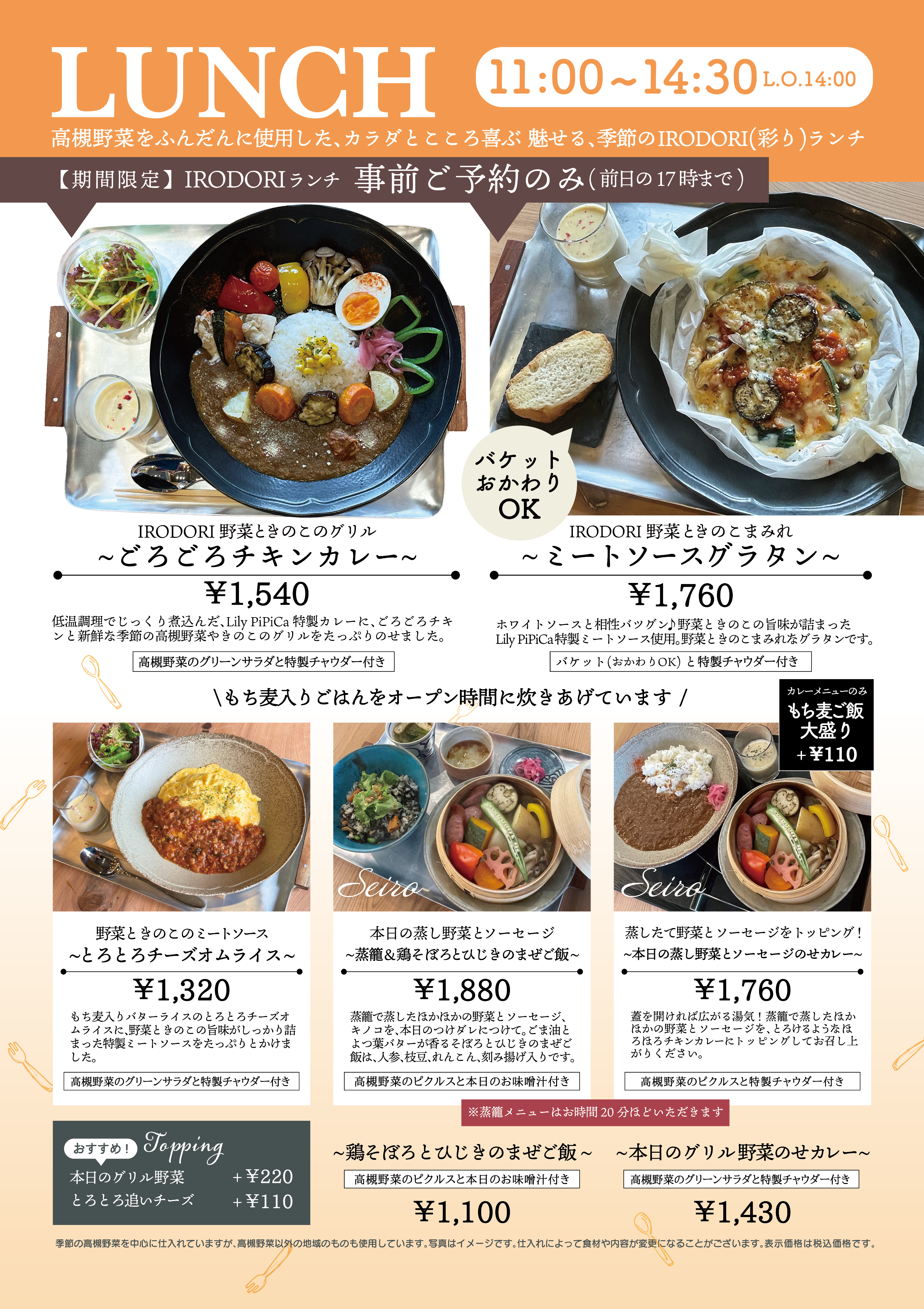 【上記のIRODORIランチ4種類は、前日17 時までの事前ご予約が必要なメニューです。】